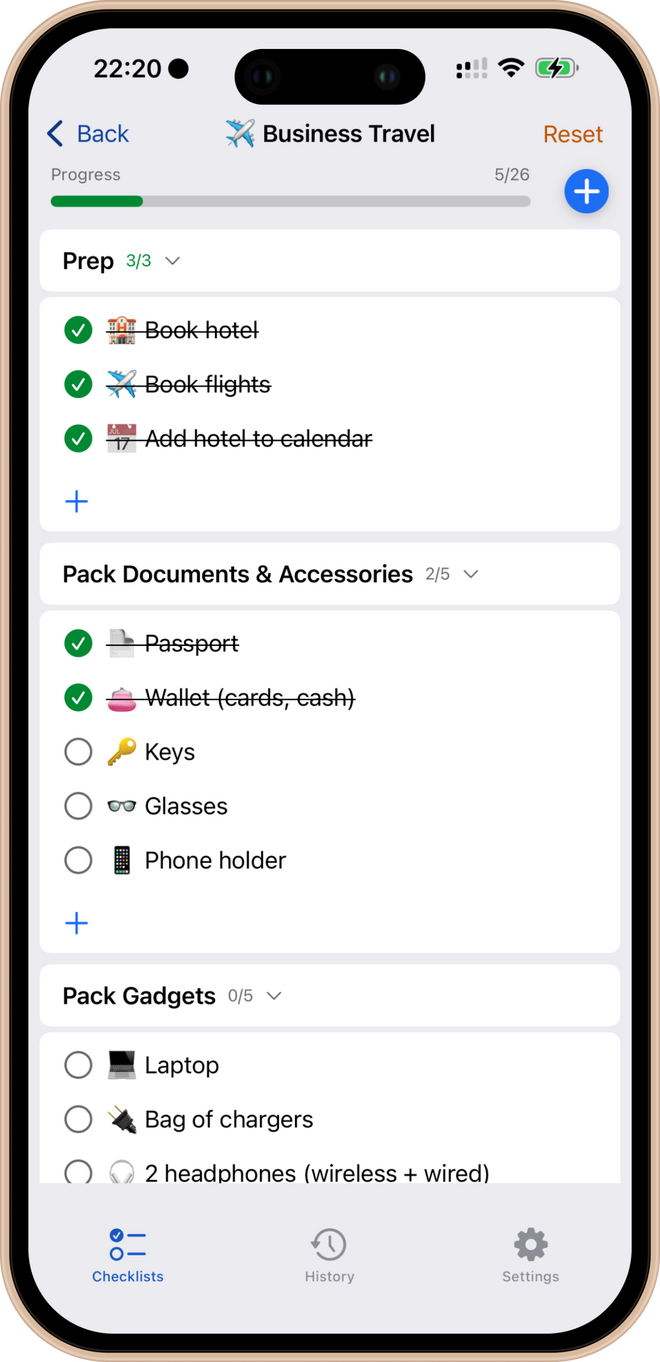 Most people rely on paper notes, the default Notes app or generic to-do lists. Fine for one-off tasks — but routines need more. A real checklist should have sections, track progress and be reusable.Think about it: heading to the gym without your heart-rate strap or forgetting your charger for a business trip. With CheckItAll, everything stays organised, structured and reusable — so you can focus on what matters, not what you might forget.